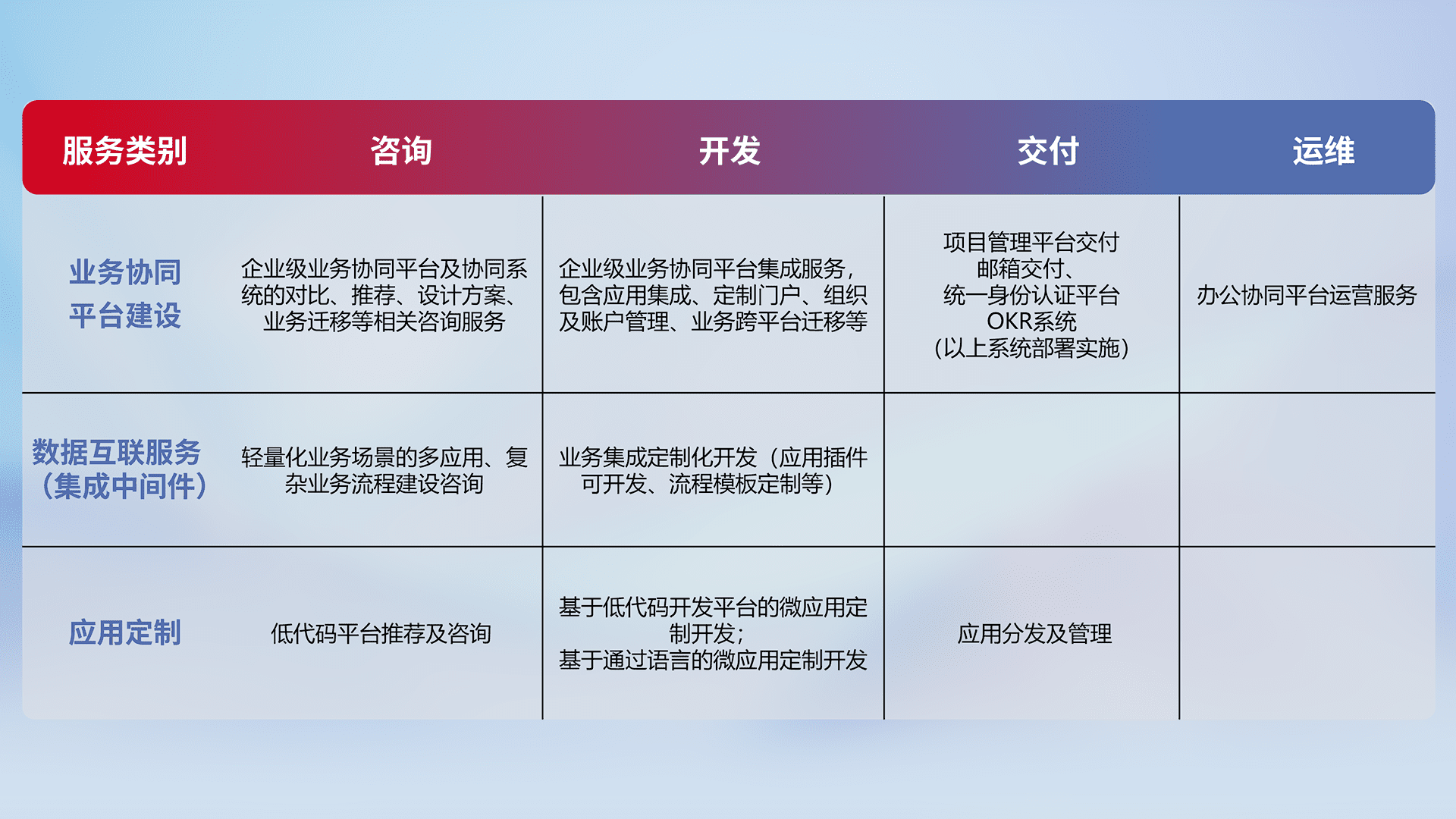 针对钉钉、、企微、、IDaas等平台级产品提供产品的规划、、、方案、、、、交付、、、、定制化开发等服务,,,实现如统一协同办公、、、智能客户服务、、、混合会议管理、、、、智能数据查询、、、等业务场景,,,,实现数字化转型。。