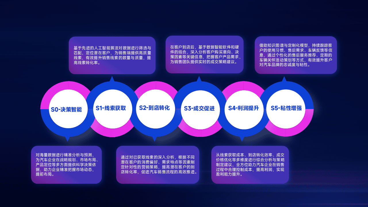 基于销售转化漏斗的薄弱环节,,,为客户提供数据+模型+运营的智能应用,,,,实现销售业绩的提升;推动线索管理全链路的精细化管理和运营。。。。